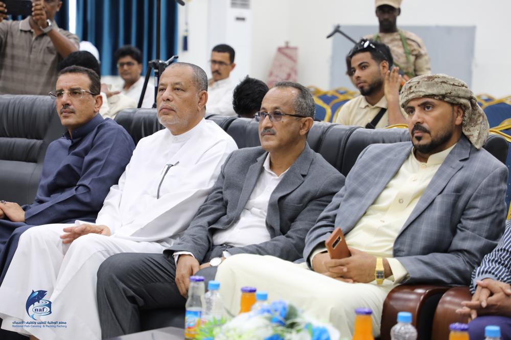 *رافق وزير الزراعة والري والثروة السمكية في زيارته للمصنع كلاً من المهندس يسلم بابلغوم رئيس الهيئة العامة للمصائد السمكية بالبحر العربي، والاستاذ عادل باعكابة المدير العام لمديرية الشحر، والمهندس محمد بن اسحاق مدير هيئة المصائد بمديرية الشحر.*