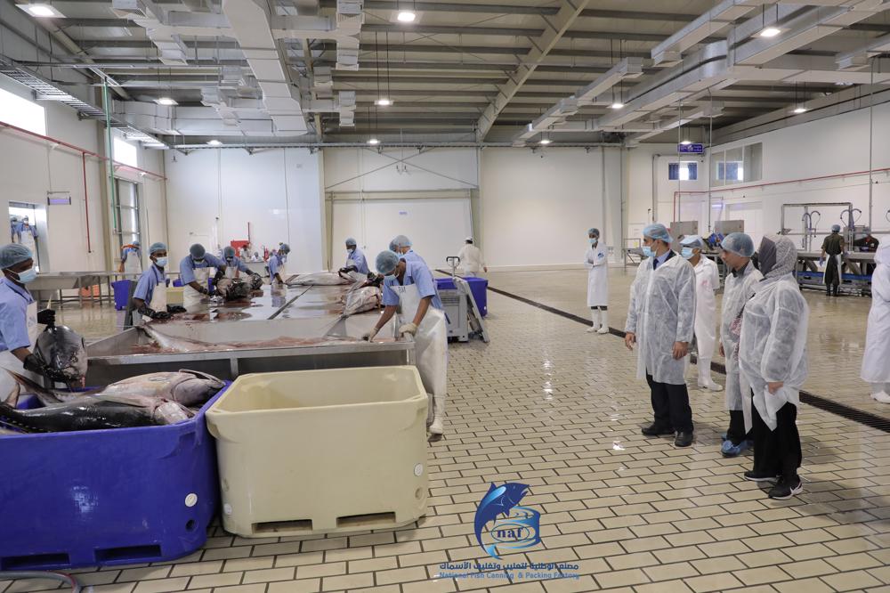 كما طافت أيضا بأقسام مصنع تعليب الأسماك، والمختبر، ومصنع طحن مخلفات الأسماك، والثلاجة المركزية، وصالة استلام وتقطيع الأسماك، متعرفة على التجهيزات الحديثة للمصانع والقدرات الاستيعابية والإنتاجية.